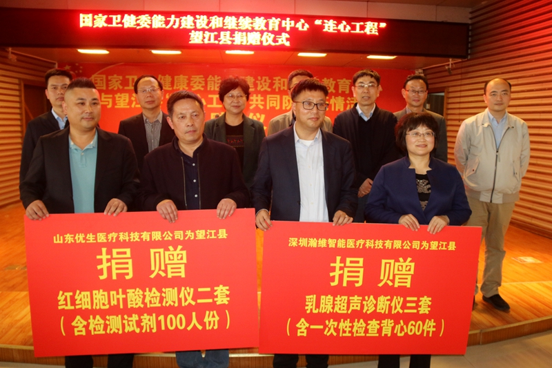 在捐赠仪式上,山东优生医疗科技有限公司、深圳瀚维智能医疗科技有限公司等两家爱心企业向我县捐赠了红细胞叶酸检测仪、乳腺超声诊断仪等价值470万元的医疗物资。