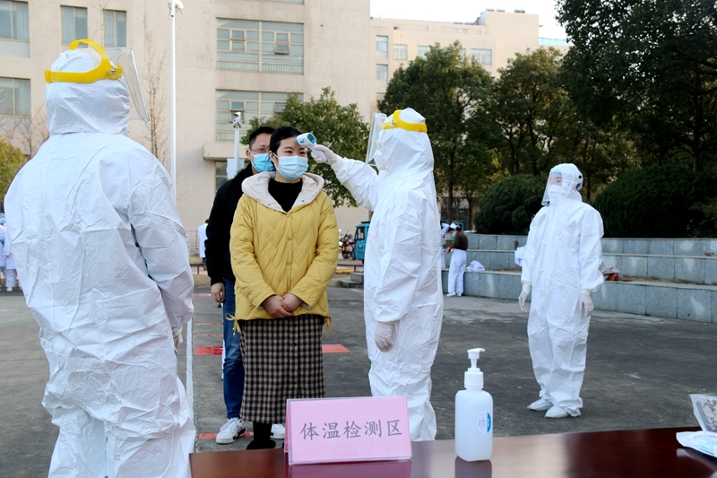 演练脚本设定为某小区发现一名新冠病毒感染者,望医接到命令,对该小区二千余位居民进行大规模核酸采样、检测。演练之前,参与人员进行了桌面推演。在演练现场,设置有体温检测区、信息采集区、核酸采样区等区域。参演人员均正确佩戴口罩并采取一米间隔排队有序进场。工作人员均穿戴防护服和面罩,每完成一例采样,都进行手卫生消毒,避免交叉感染。发热病人在工作人员的引导下从专用通道登上救护车,运往医院进行隔离、检查和治疗。