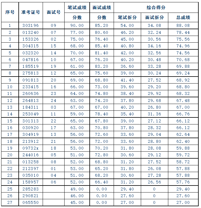 根据《2021年望江县医院自主公开招聘临床医学专业技术人员公告》,经笔试、面试,现将考试总成绩予以公示(附表)。公示期5个工作日。联系电话:医院监察审计科0556-7186735,人力资源部0556-7173616,医教科0556-7187314。