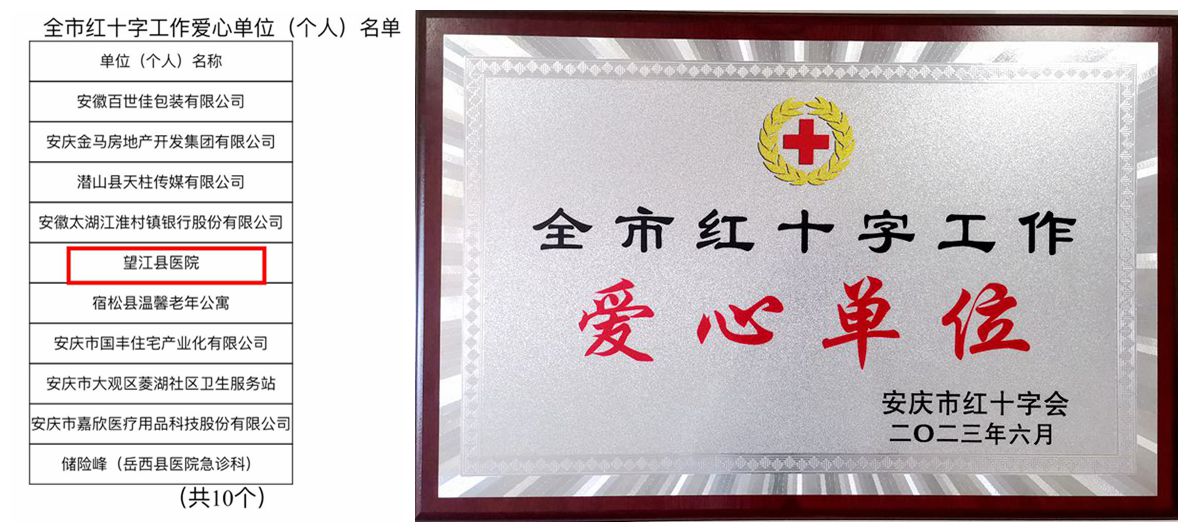 为激励先进,推动社会各界更加广泛地参与和支持红十字事业,形成促进红十字事业发展的合力,6月9日,安庆市红十字会对一批甘于奉献、服务群众、热衷公益的先进集体和先进个人通报表扬,望江县医院荣获“全市红十字工作爱心单位”荣誉称号。